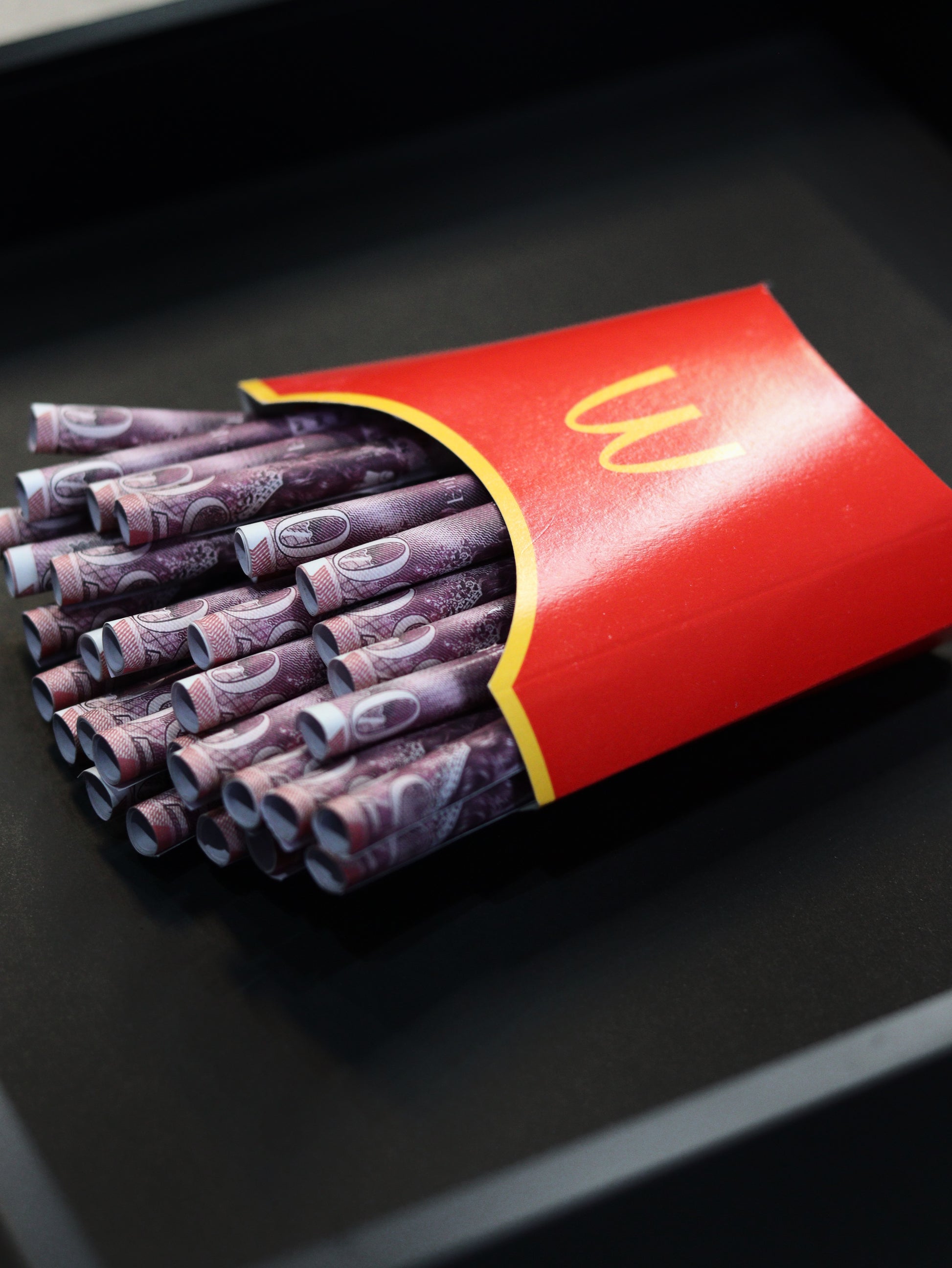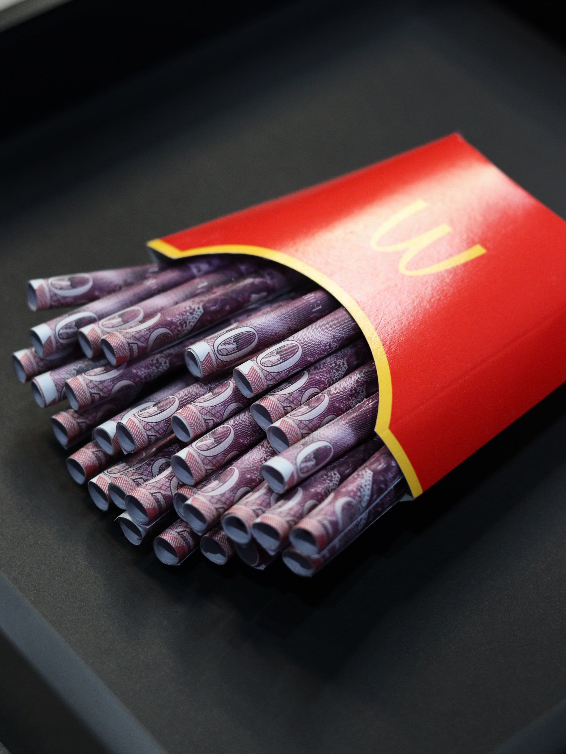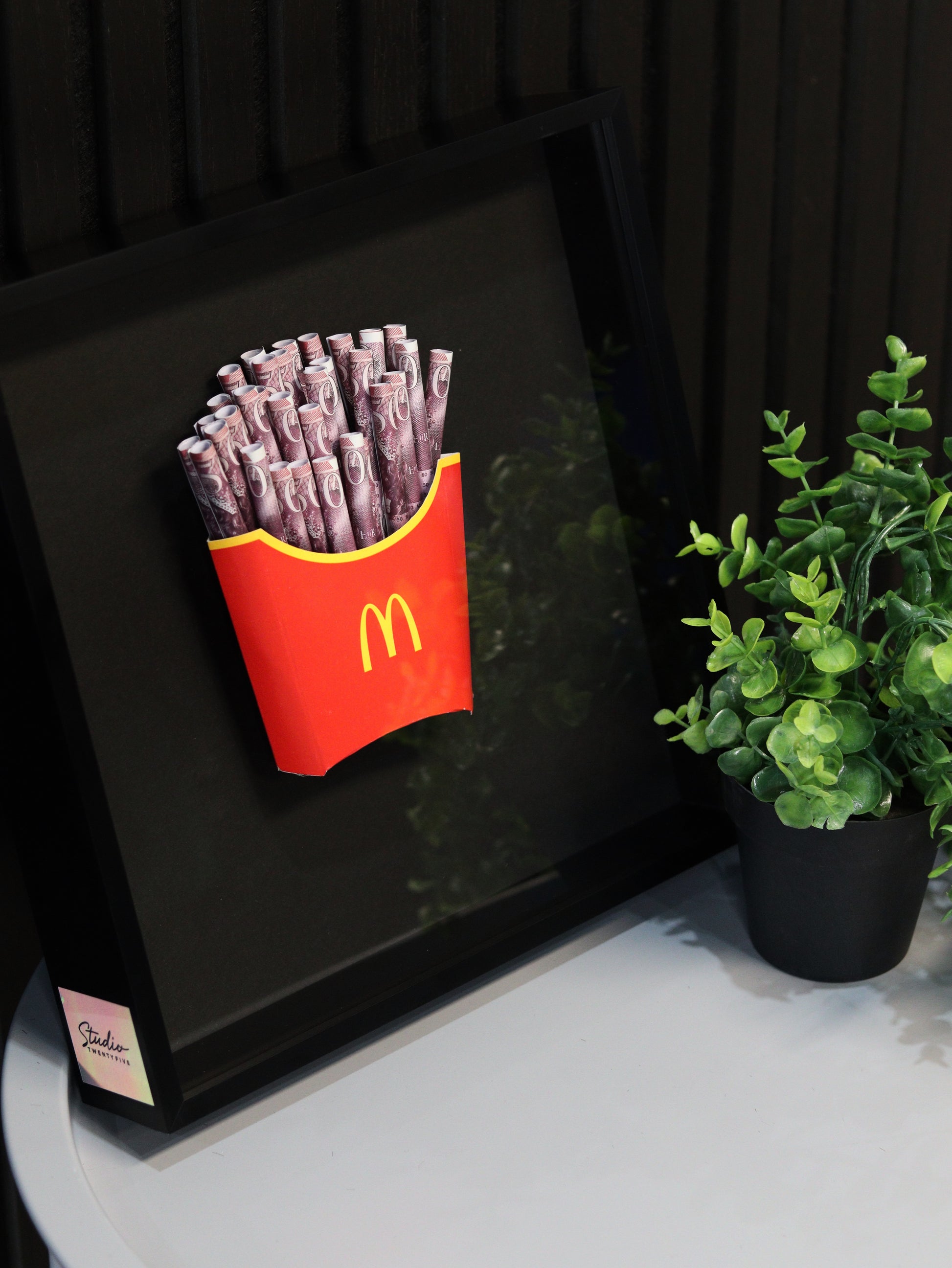 Introducing “Appetite For Success” - a bold statement piece that turns everyday hustle into art. This premium frame features a McDonald’s-style fries carton overflowing with neatly rolled banknotes - because at StudioTwentyFive, we believe money is the main course.