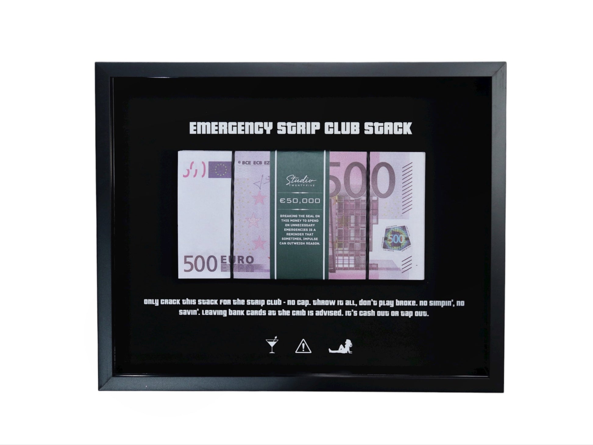 Featuring a realistic cash stack wrapped in a sleek StudioTwentyFive money band, this piece is both motivational and stylish, inspiring you to see what’s possible with a little hustle.