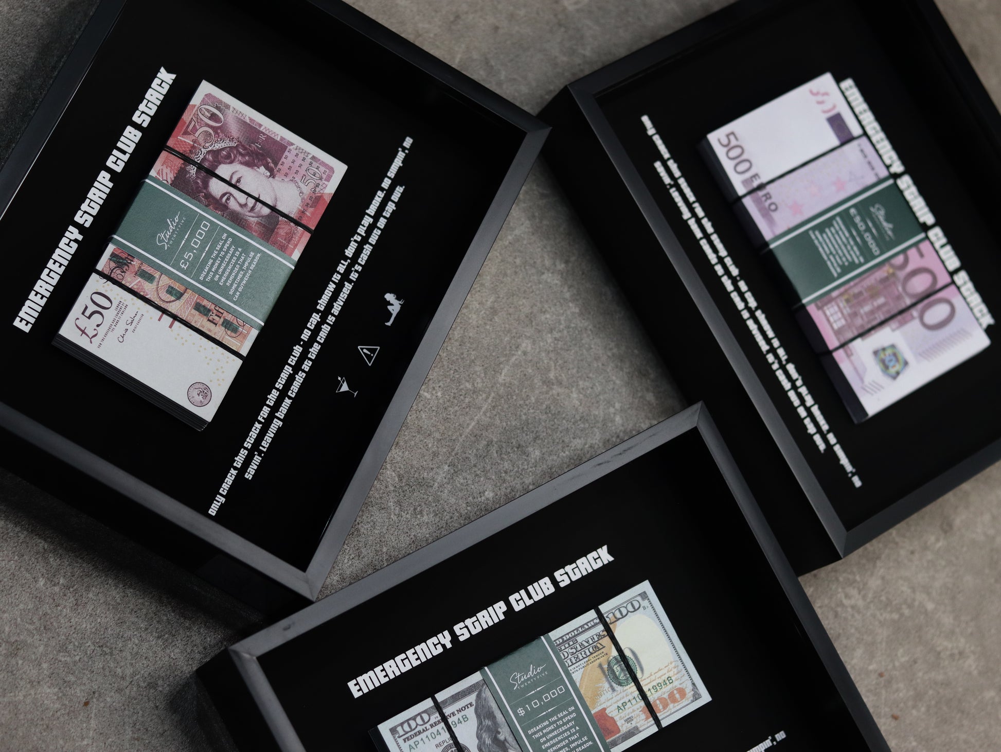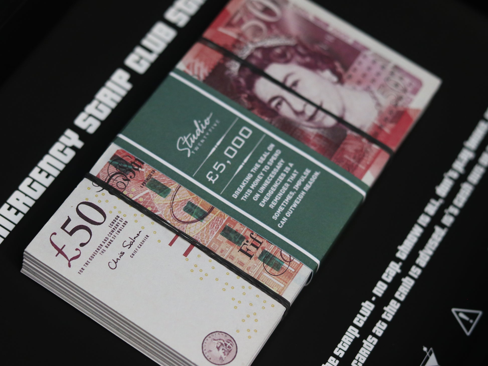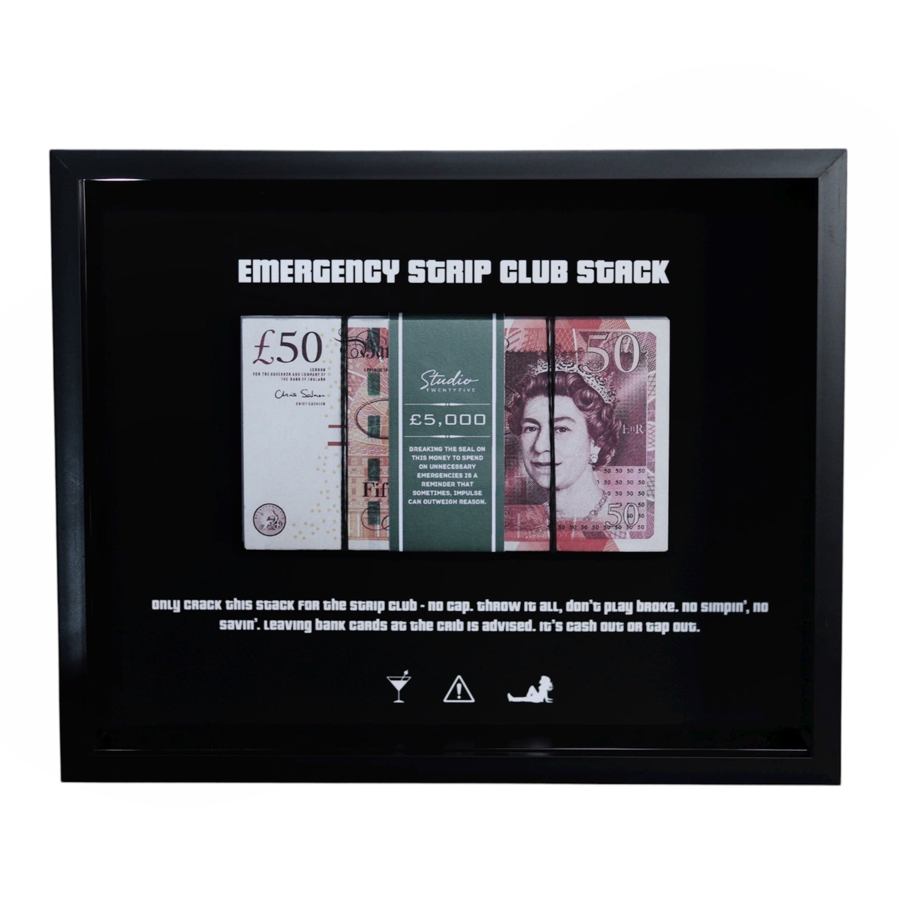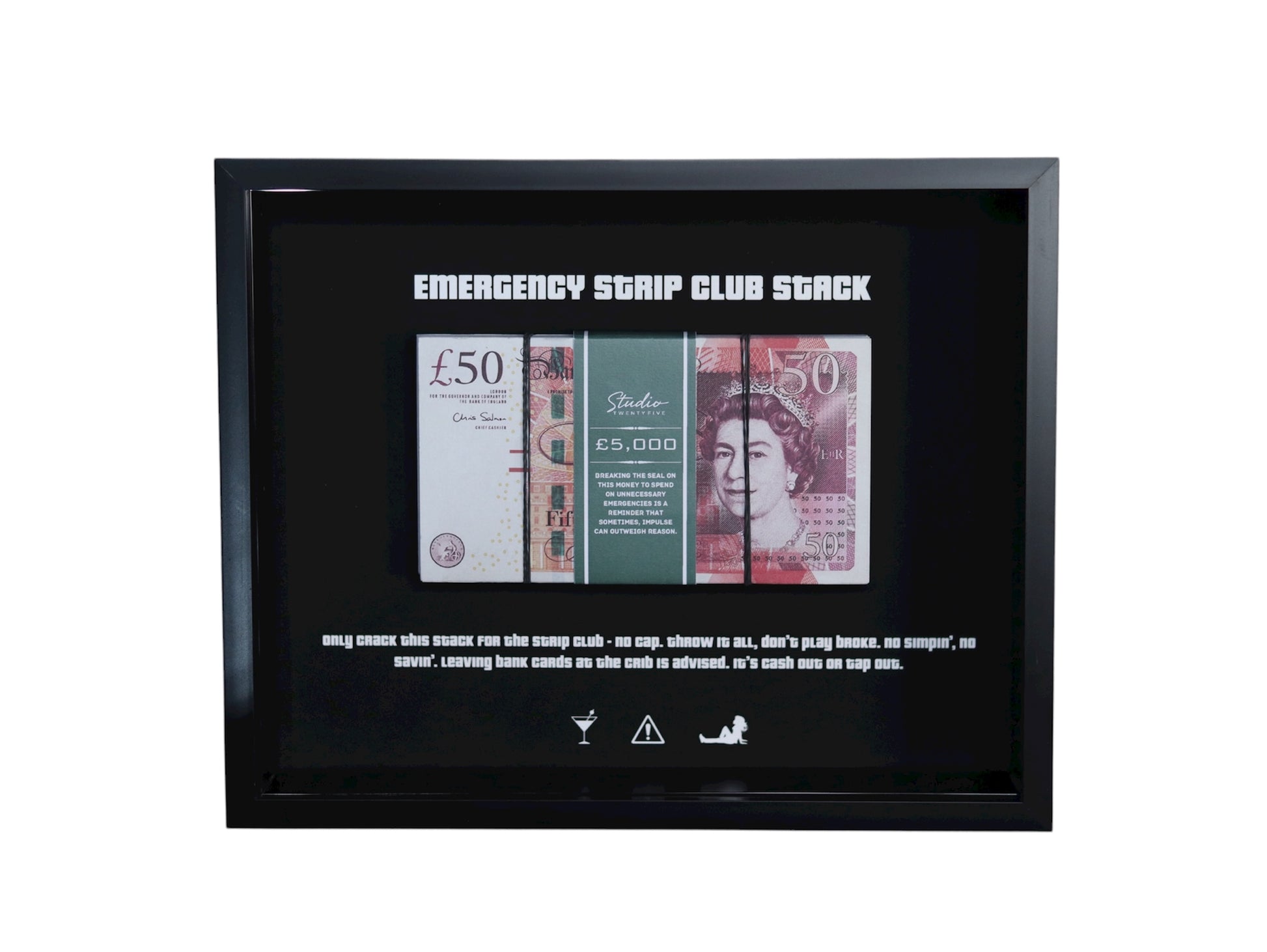 Featuring a realistic cash stack wrapped in a sleek StudioTwentyFive money band, this piece is both motivational and stylish, inspiring you to see what’s possible with a little hustle.